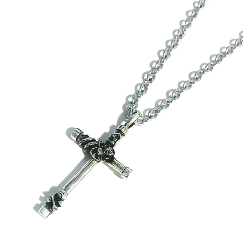 十字架に刻まれた各モチーフは綿密に細部まで表現する完成度の高さ。男女問わずにつけられるユニセックスアイテム。