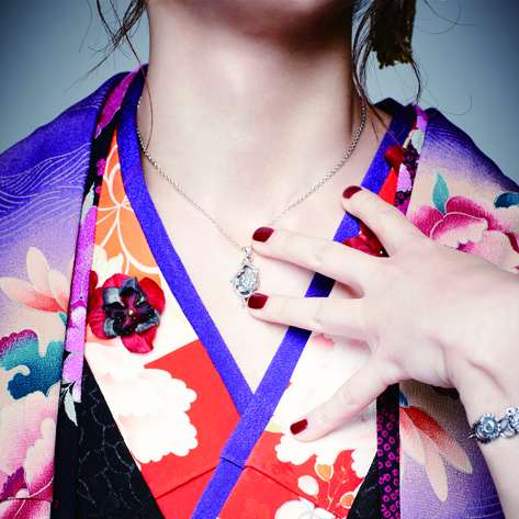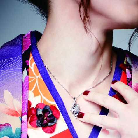 降り続く雨の中、じっと忍ぶように咲き続ける紫陽花の姿を表現。 紫陽花と唐草が流麗に絡み合った優美さ、花弁や裏面の立体的な作り込みが芸術的なクオリティーを生み出している。