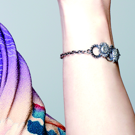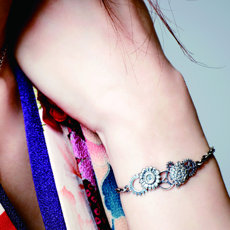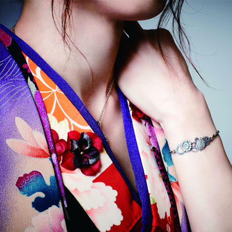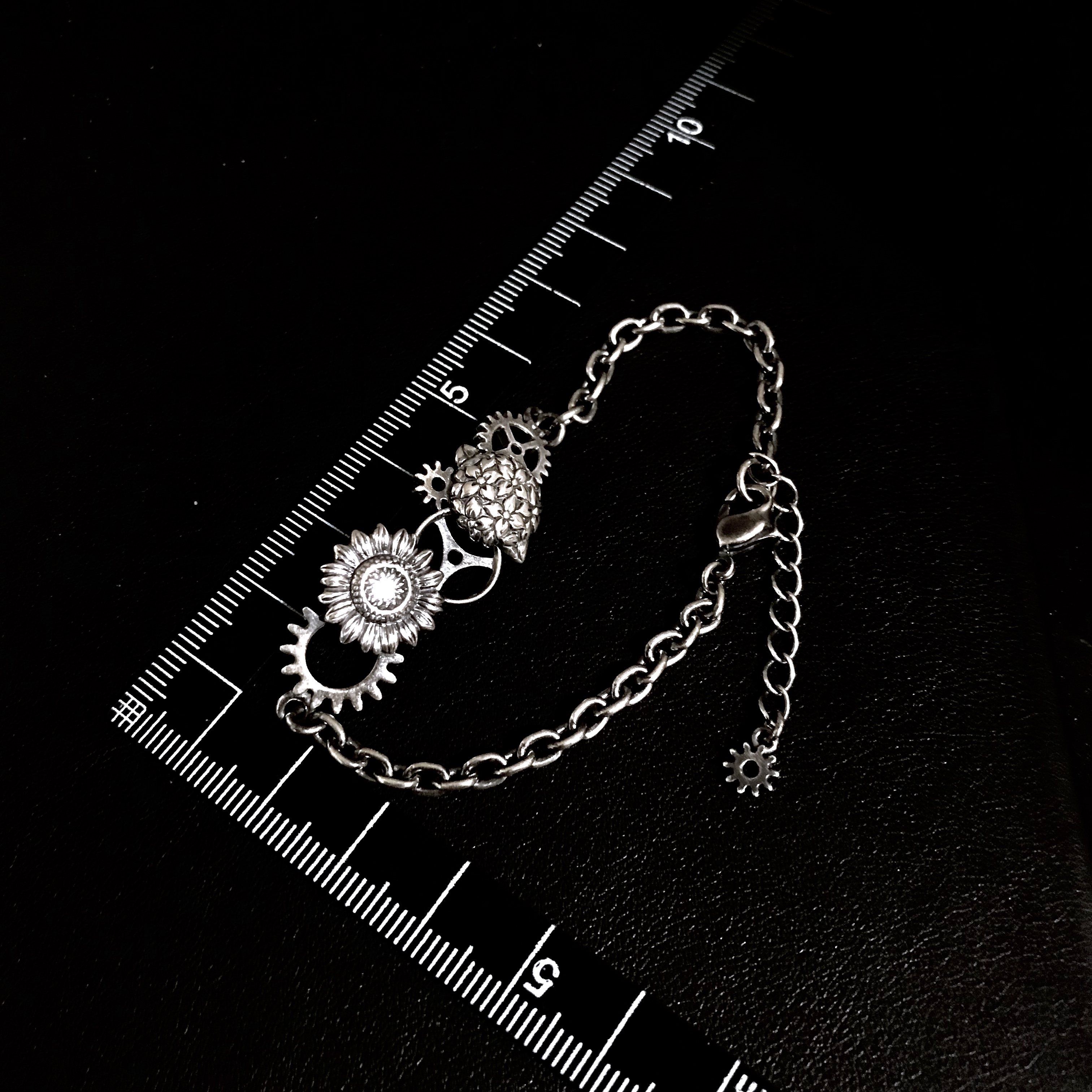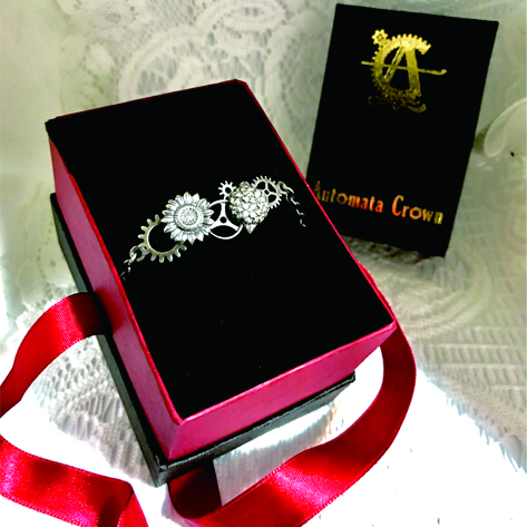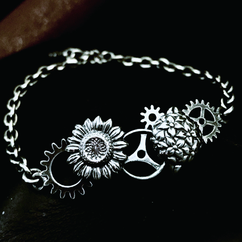 花の裏側にも歯車を配置する拘りで、花も一緒に動き出しそうな雰囲気を醸し出す。絶妙なアールを付け、装着感も良い。エンドパーツはライブ中に付けていても外れにくいようにカニカンを採用している。