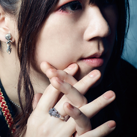 有機的な紫陽花、向日葵と無機質で機械的な配線ケーブルが融合したリング。そのフォルムはブランドが持つ独自の世界観を存分に表現している。