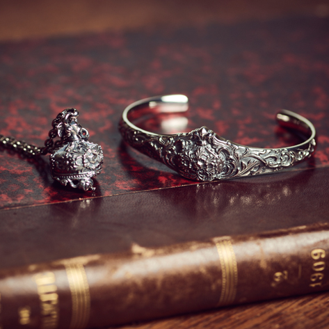 麗人オートマタのアナザーストーリー『Crown of sorrow』のメインアイテム【王冠】をコンセプトにデザインされた。 『陥落シンフフォニア』の王冠をベースに形成されたバングル。リコリスとは彼岸花の学名:Lycoris radiataから命名。ペンダント同様の芸術的なクオリティー、王冠から広がるしなやかで繊細な柄の優しい風合いが魅力。女性がつけるとティアラを身にまとっているようで美しい...※亜沙着用→Large