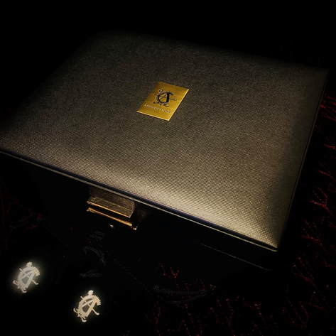 アンティーク加工のロゴプレートがついた特製ボックス。
